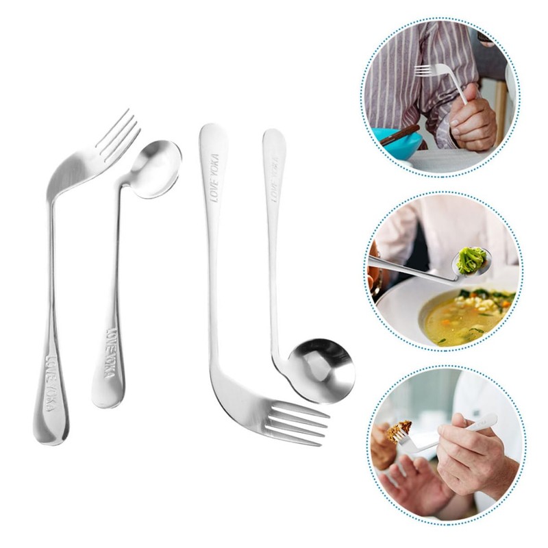 KOMBIUDA Stainless Steel Adaptive Utensils Angled Spoon Fork 4pcs Set Comfortable to Hold for Elderly Angled Feeding Fork Kitchen Utensils