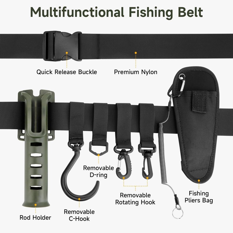 - Multi-Functional Fishing Wader Belt - Includes 1 removable D-ring, 1 removable C-hook, 2 rotating hooks, 1 rod holder, and 1 fishing pliers bag. All accessory attachments are removable so you can DIY the belt to suit your needs.