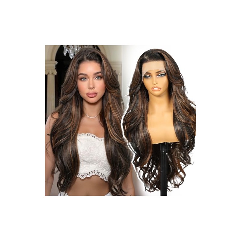 KOME Brown Highlight Synthetic Lace Front Wig,13×6 Body Wave HD Lace Glueless Wigs for Women Natural Daily Use 28IN