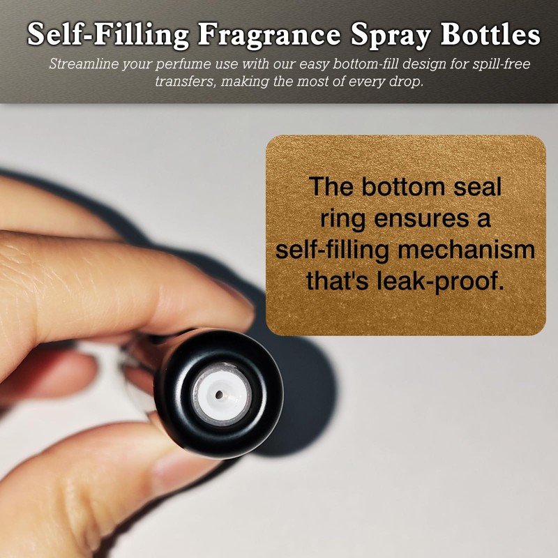 • SELF-FILLING DESIGN: Simplify your fragrance routine with our innovative bottom-fill technology, allowing you to transfer perfume without spills or the need for additional tools, ensuring every drop of your precious scent is utilized.