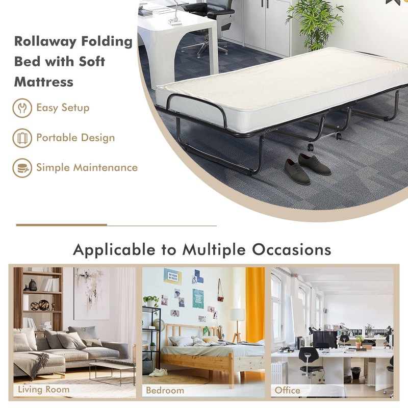 - Multipurpose Folding Bed: This rollaway bed with mattress is the perfect solution to provide temporary sleeping place for small spaces, ideal for guest rooms, apartments or dorms. It can work as a convenient extra guest bed when your friends come to visit, a living room daybed, a comfy camping cot during vacation or an office nap bed.