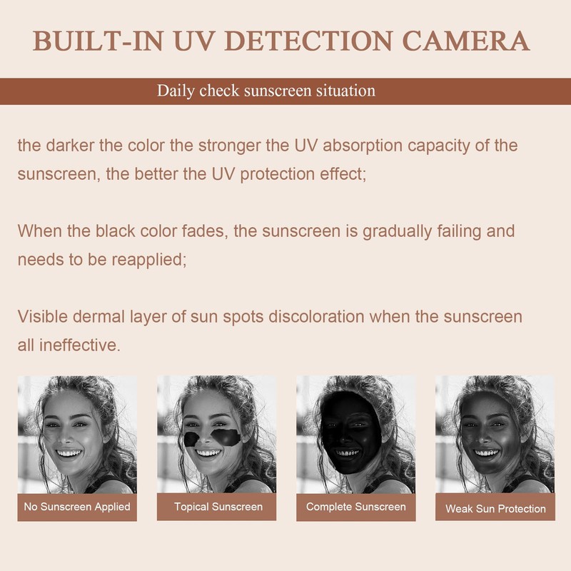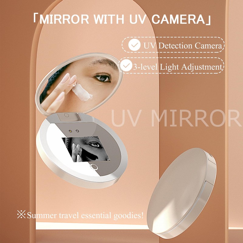 - ZUM SONNENSCHUTZTEST: Dieser UV-Kameraspiegel zeigt und überprüft Ihre Sonnenschutzanwendung, den HD-Bildschirm und die vergrößerte Anzeige, damit Sie Sonnenschutzmittel gleichmäßiger auf Ihr Gesicht auftragen können. Wichtig ist, dass dieser kleine Spiegel Sie jederzeit daran erinnert, Ihre Haut zu schützen.