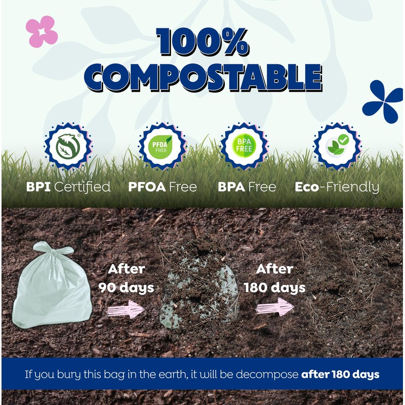 - 100% Compostable At Home: Got kitchen scraps and other food waste? What about leaf litter from your garden? Both of those can be bagged in our biodegradable trash bags and thrown in your compost pile. In 180 days (6 months), it will have broken down completely. BPI Certified.