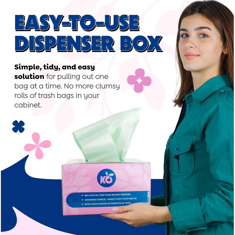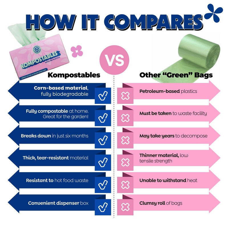 - Puncture/Heat Resistant with Strong, Easy-Tie Handles: Engineered to handle tough kitchen waste without tearing or leaking, these handle tie, eco-friendly trash bags are built for dependable performance. Kompostables are thicker and more heat resistant than other large compost bags, which often melt when in contact with warm food.
