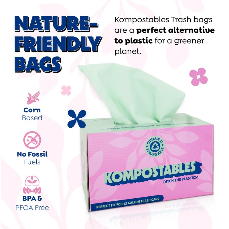 KOMPOSTABLES 100% Home Compostable Kitchen Trash Bags, 13 Gallon, Unscented Corn Plastic Bags w/Handles, 49 Liter Tall, Biodegradable Garbage, Compost & Food Scrap Waste Can Liners, Heavy Duty, 35 Ct