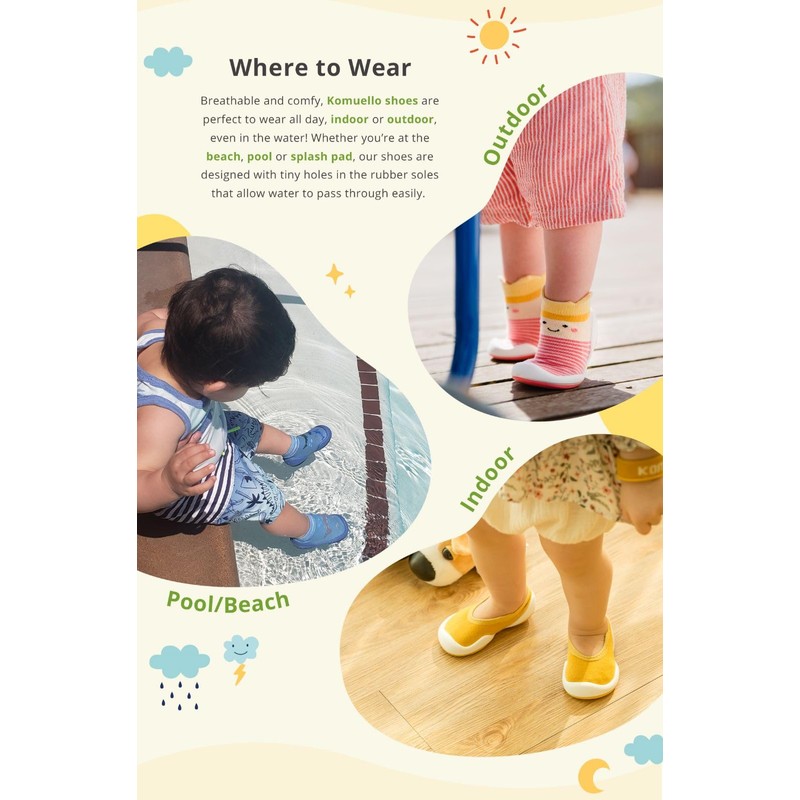 - Stay-On Comfort: Experience the perfect fit with Komuello's toddler sock shoes, designed with a cotton top that wraps comfortably around little feet. Our superior elasticity ensures they stay on securely, making them easy to put on and take off.