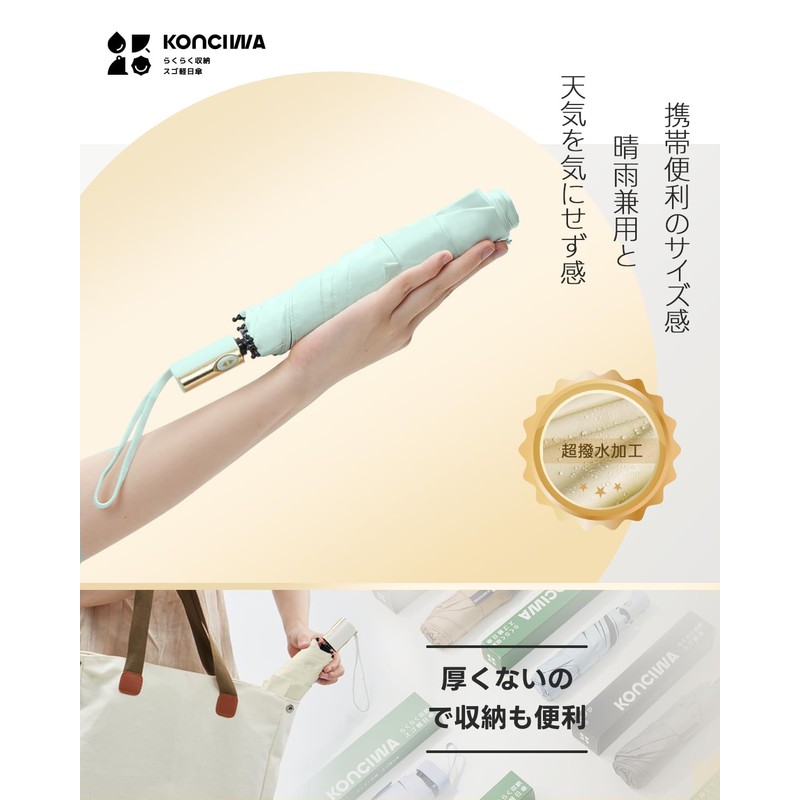 - Large and more practical. For both sunny and rainy weather, konciwa strives to be used while maintaining light weight. The umbrella surface is enlarged to 38.2 inches (97 cm) and is 3.9 inches (10 cm) larger than normal folding umbrellas for both sun and rain. It can be used on sunny and rainy days, but it is a size that is comfortable to wear. 310T high-density water repellent layer instantly repels rain water and dries easily for quick storage
