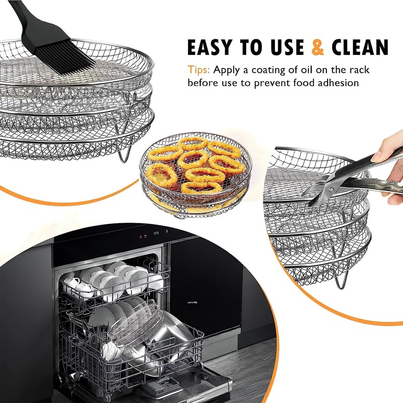 - ★【Lebensmittelechter Edelstahl】Unsere Luftfritteusen-Regale sind aus lebensmittelechtem 304 Edelstahl, der BPA-frei, hitzebeständig und verformungsbeständig ist. Die Luftfritteuse ist gut verarbeitet und das Gestell ist glatt und gratfrei. Darüber hinaus ist das Luftfritteusengestell leicht zu reinigen. Handwaschbar und spülmaschinenfest. Praktisch und spart Reinigungszeit.