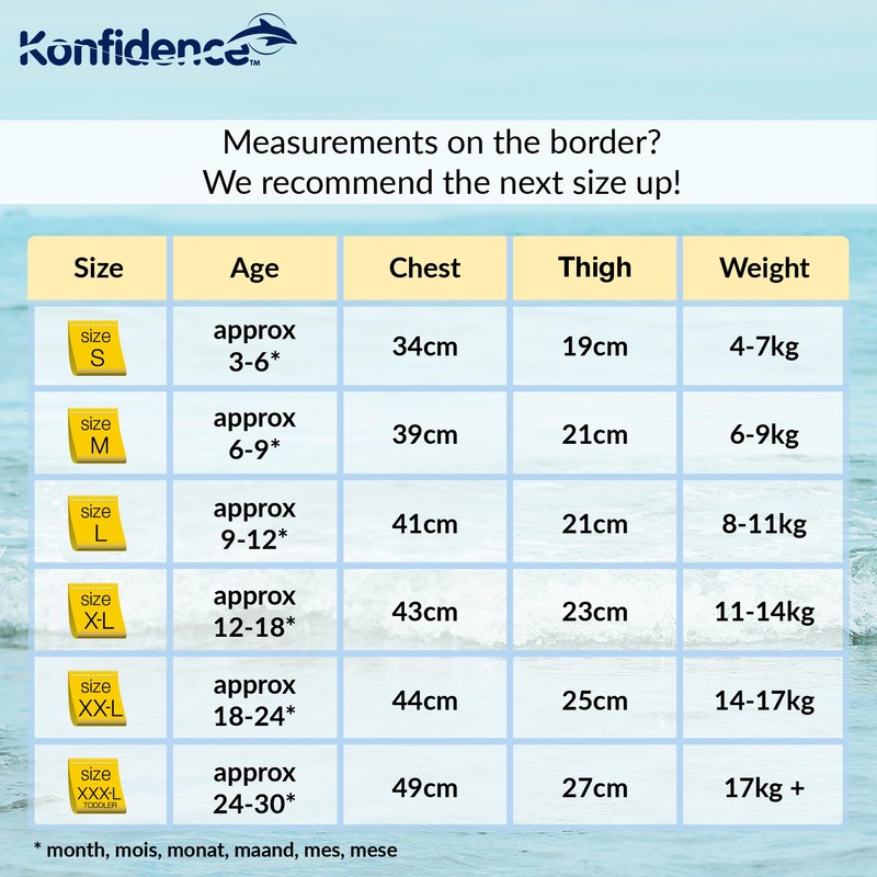• PLEASE CHECK THE SIZE GUIDE: Konfidence Splashy swim nappy cover is a garment and in this instance does come up small. They should fit reasonably snug, We strongly recommend to measure your child to "Get a great fit" and check out our SIZE GUIDE, however if you are in doubt we would recommend ordering the next size up.