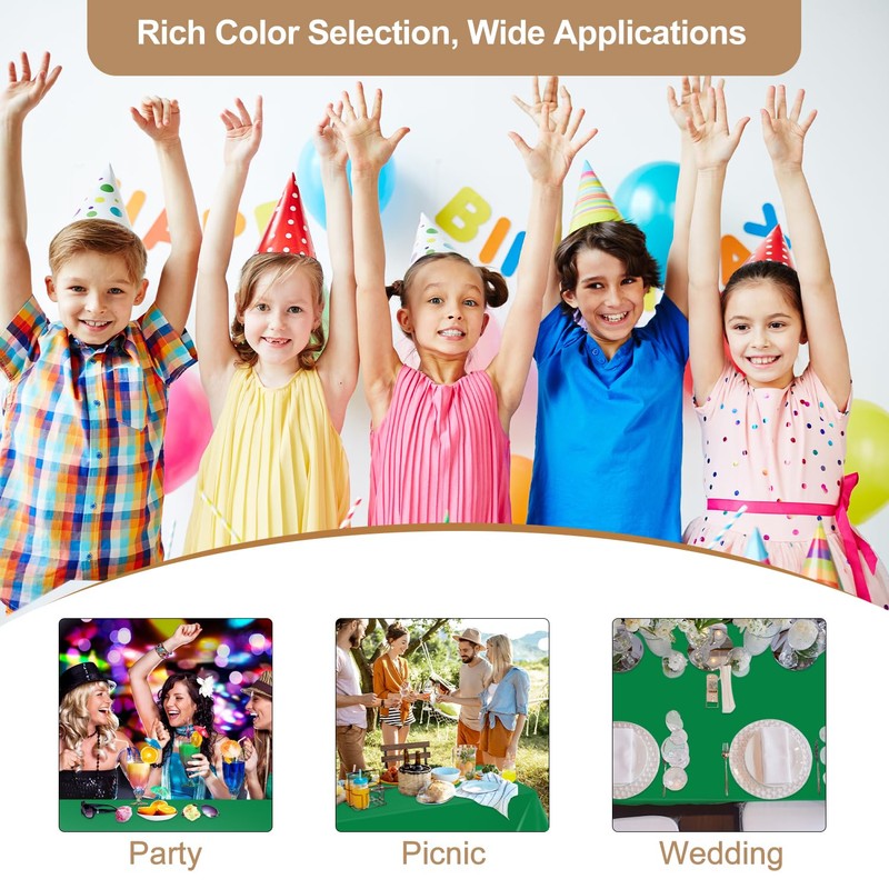 • Multiple Color Selection: When you want to host a variety of different types of themed parties, we have more than a dozen different colors of plastic tablecloths for you to choose from, adding to the atmosphere of the party.