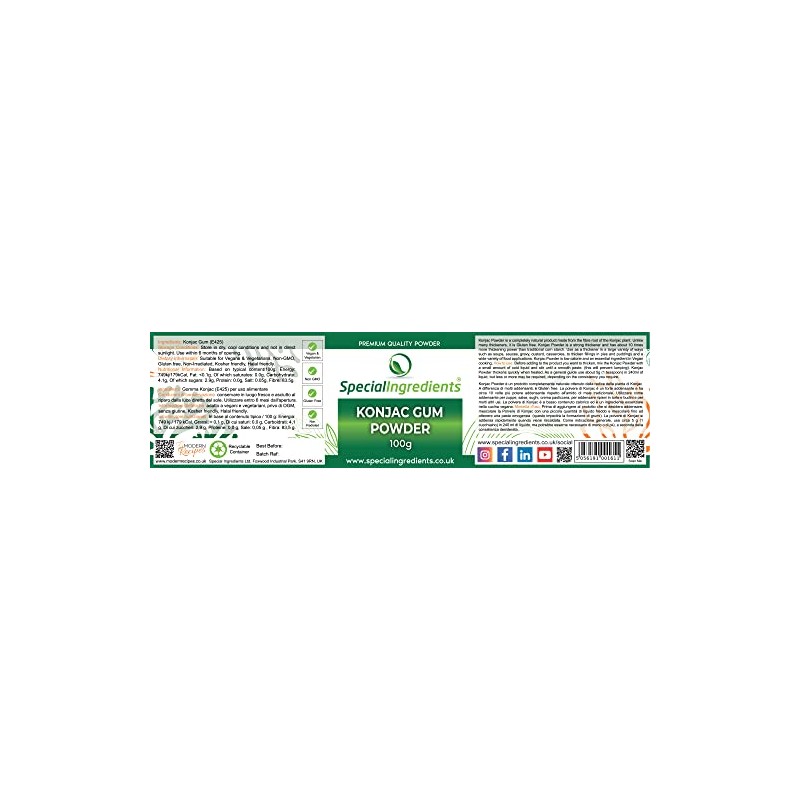 Konjac Powder is a completely natural product made from the fibre root of the Konjac plant. Unlike many thickeners, it is Gluten free. Konjac Powder is a strong thickener and has about 10 times more thickening power than traditional corn starch. Use as a thickener in a large variety of ways such as soups, sauces, gravy, custard, casseroles, to thicken fillings in pies and puddings and a wide variety of food applications. Konjac Powder is low calorie and an essential ingredient in Vegan cooking. Suitable for Vegans & Vegetarians, Non-GMO, Gluten free.