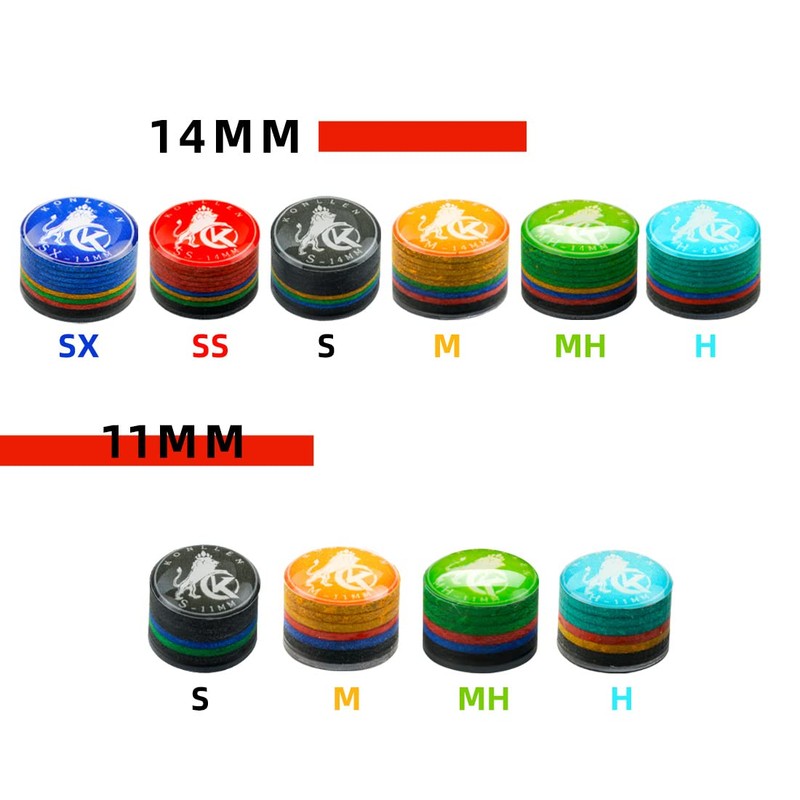• 🎱Diversity: KONLLEN rainbow billiard cue tips have 6 kinds of hardness (SX/SS/S/M/MH/H) and 2 kinds of sizes (11mm/14mm). This gives 12 free combinations to choose from. There is always a tip that matches your cue.