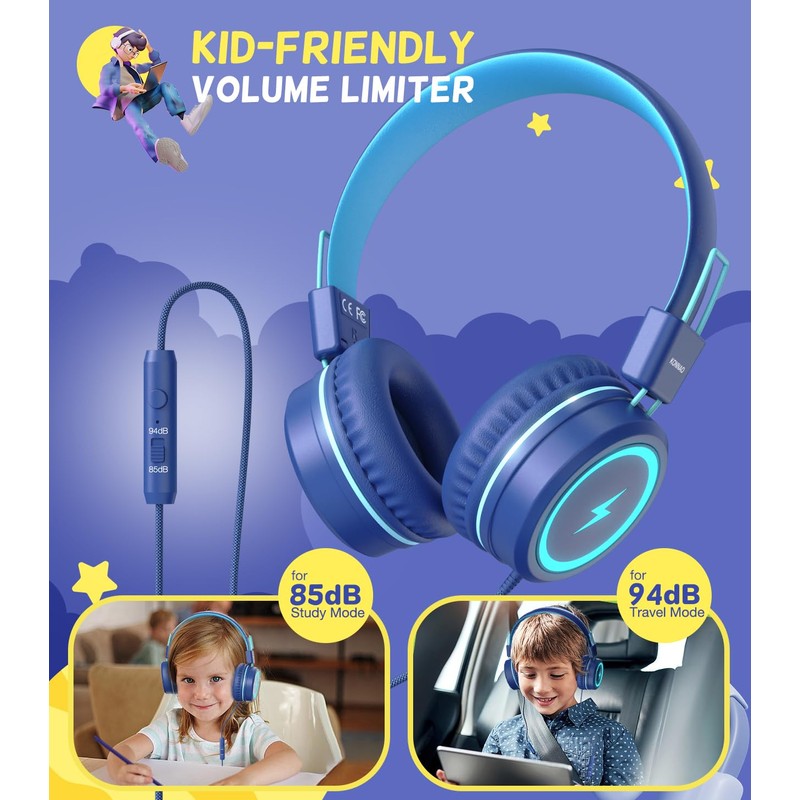 - 【LED-Blitzbolzen-Design】Wenn die Kinder-Kopfhörer für die Schule mit Mikrofonstecker-Gerät, können Sie genießen, einzigartige LED-Blitzlichter einzuschalten, und Sie können wählen, das Licht an oder aus zu halten, indem Sie einfach einen Klick auf die Schaltfläche klicken. Geben Sie Ihrem Kind einen speziellen Jugendkopfhörer für die Schule.