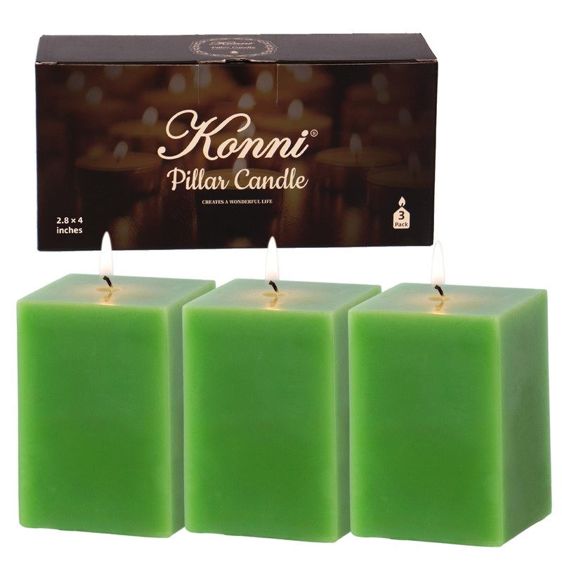 - GREAT VALUE SET: Each green unscented pillar candle set comes with 3 pack candles of 2.8''x4''. Pillar candle set comes wrapped in a sturdy divided cardboard box to ensure candles arrive neatly packaged and undamaged