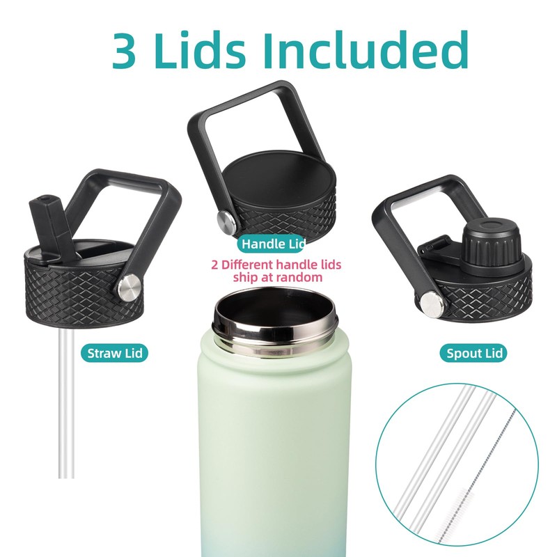 - The water bottle comes with 3 lids for different beverages, a sip lid for hot drinks, a straw lid for iced beverages, a flex-removable lid(2 different handle lids ship at random) for smoothies or fruit drinks. All lids are BPA-free, leak-proof, and dust-proof, catering to your needs