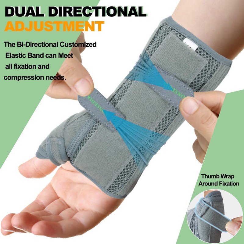 - 【UNIQUE DESING&PERFECT COMBINATION】This Thumb Spica Wrist Splint comes with a soft thumb strap and an integrated thumb wrist hardware fixing plate.The Wrist Brace uses two reverse integrated elastic drawstring hook buckle wrist fixing systems,which can be freely hooked and fixed,easy to wear,and can be adjusted freely.Adopting a new type of palm spoon shaped aluminum alloy wrist support,the Carpal Tunnel Brace provides uniform support, can stabilize the wrist joint more stable.
