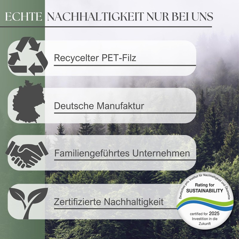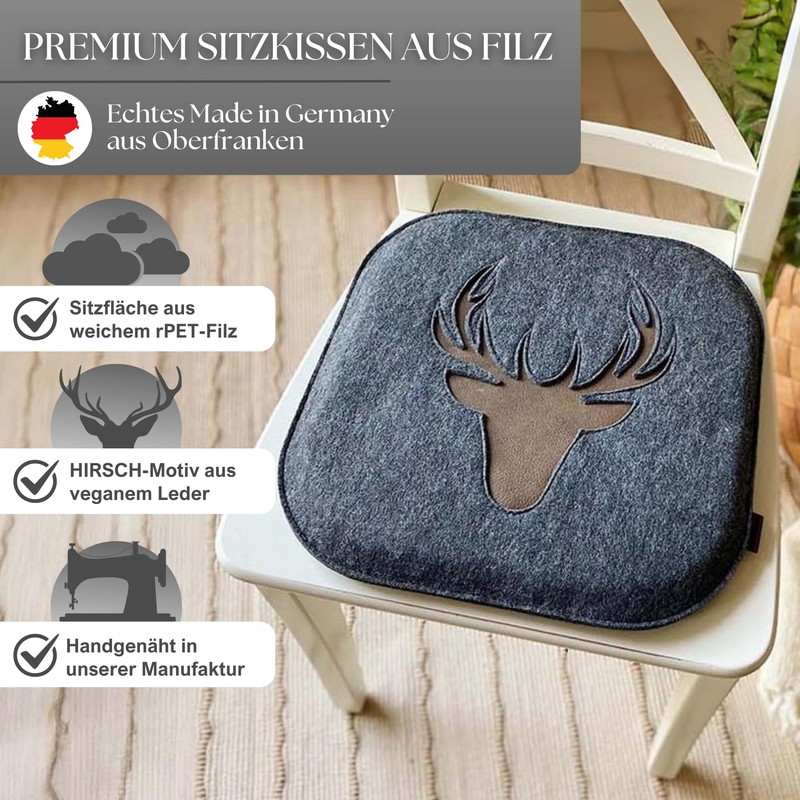 - Handmade in Bavaria – we lovingly handmade our felt chair cushions for you in our factory in Bavaria. Whether as a seat cushion felt square 40 x 40 cm or as a bench cushion felt, our chair seat cushions are perfect for your interior style.