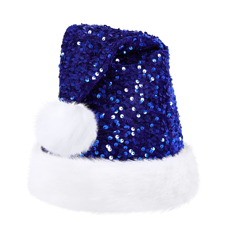 KONVINIT Adult Christmas Hat, Santa Hat with Shiny Sequins and Plush Edge, Santa Hat for Festive Christmas Party, Christmas Tree Topper, Blue