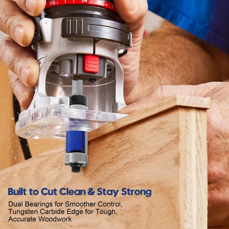 Konvixon Flush Trim Router Bit Set includes 4 bits and 12 extra parts. Made with YG6 tungsten carbide blades and a high-strength carbon steel body, it offers sharp, durable performance. The dual top & bottom bearing design ensures stable, precise cuts. Ideal for wood, MDF, and laminate, it delivers smooth trimming for all your woodworking needs