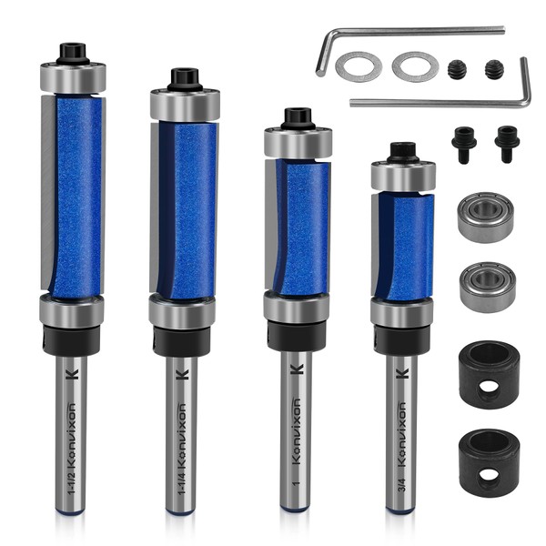 Konvixon 4Pcs Top and Bottom Bearing Flush Trim Router Bits Set 1/4 Inch Shank, Pattern Flush Trim Router Bit with 2 Extra Bearing Kits, 1/2 Inch Cutting Dia., 3/4", 1", 1-1/4", 1-1/2" Cutting Length
