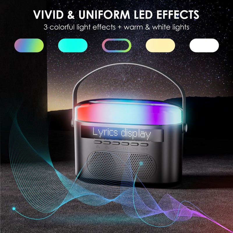 - Wireless Connectivity & Universal Compatibility: Pair devices instantly via cutting-edge Bluetooth 5.3 (50ft range) while dual mics auto-sync for zero-lag duets. Flexible connectivity options include USB/TF card slots, AUX input, and compatibility with Android, iOS, TVs, tablets, and car stereos - making this your ultimate portable karaoke hub.