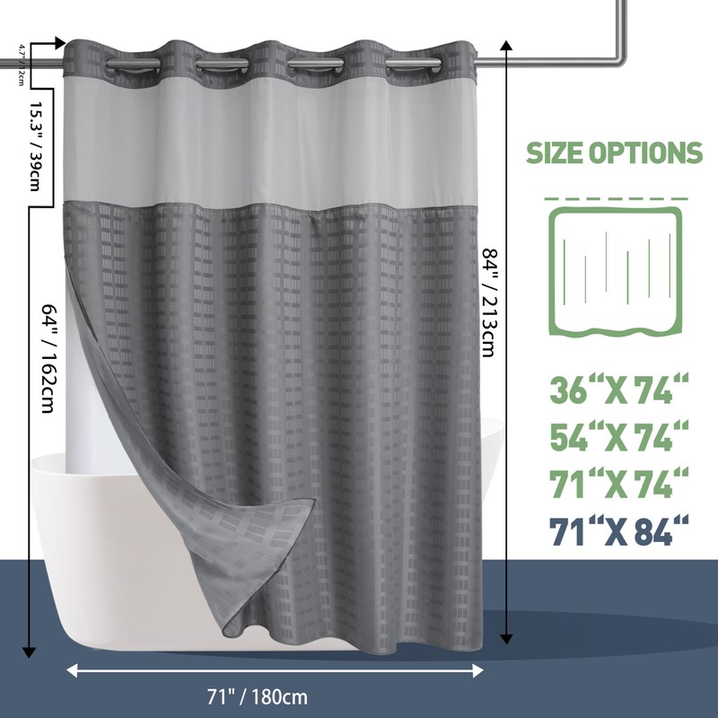 - Shower Curtain Size: 71" (W) X 74" (H) , 71" (W) X 84" (H), 108" (W) X 74" (H) Fits many standard size shower/tub and works with straight or curved shower rods.