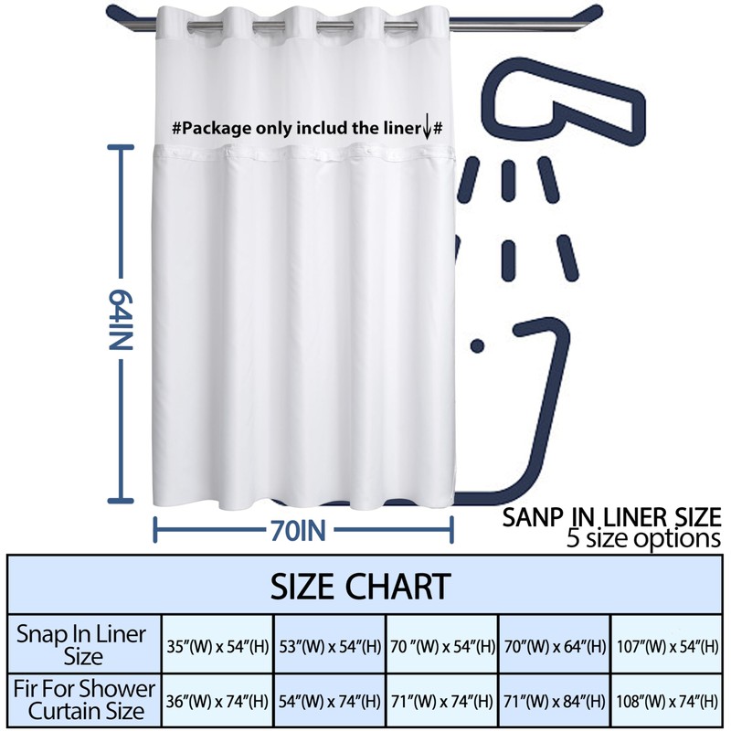 - Size of liner : We offer 3 sizes to choose, 70x54, 70x64, 107x54.and they are designed to fit with shower curtains that are 71x74 inches, 71x84 inches,108x74 inches.