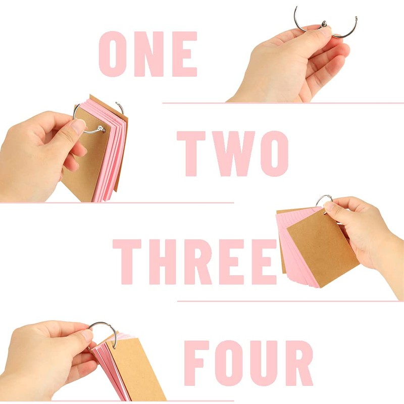 500 pieces A8 lined index cards in 5 different colours, 10 pieces kraft paper and 5 loose leaf rings that are easy to install and hold together.