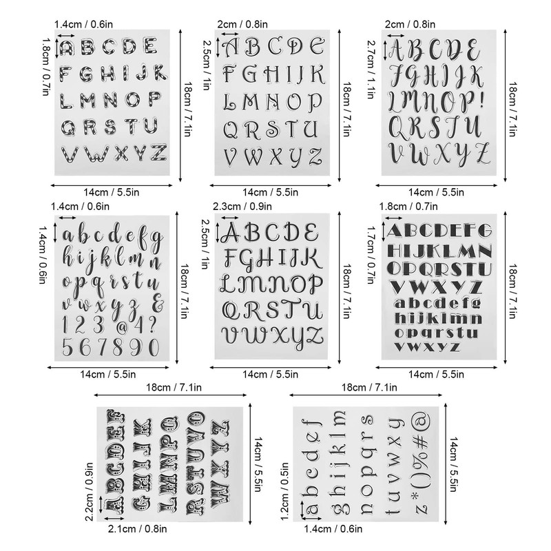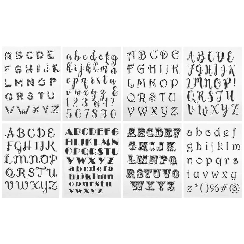 - 8 PCS Alphabet Number Stamp: The alphabet stamp package contains 8 clear letter stamps. The transparent letter stamps are mainly designed with uppercase and lowercase letters. The letter patterns of the 8 transparent stamps are in different shapes. Letter and number stamps are reusable materials, suitable for various daily DIY