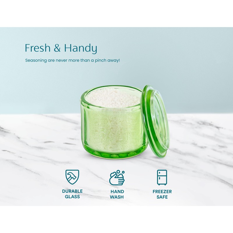 KooK KooK Glass Salt Cellar, with Lid, Embossed Pressed Glass, Clear Storage Container, for Coffee, Sugar, Spices and Candies, 10 oz (Lime Green)
