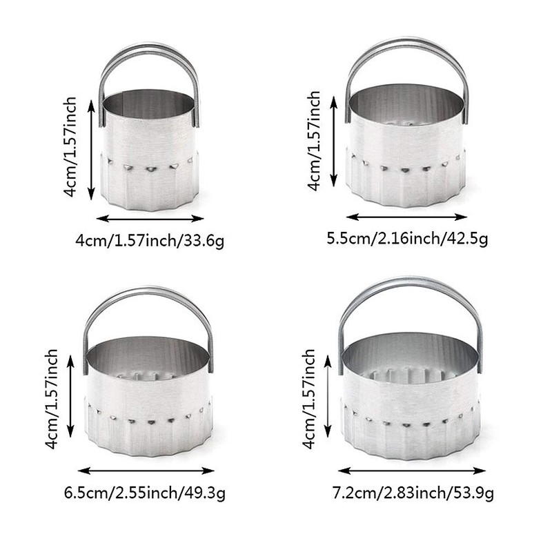 Includes 4 cutters in 4 Diameters: 1.57 Inch,2.16 inch, 2.55 inch,2.83 inch.For 4 sizes of cookies.
