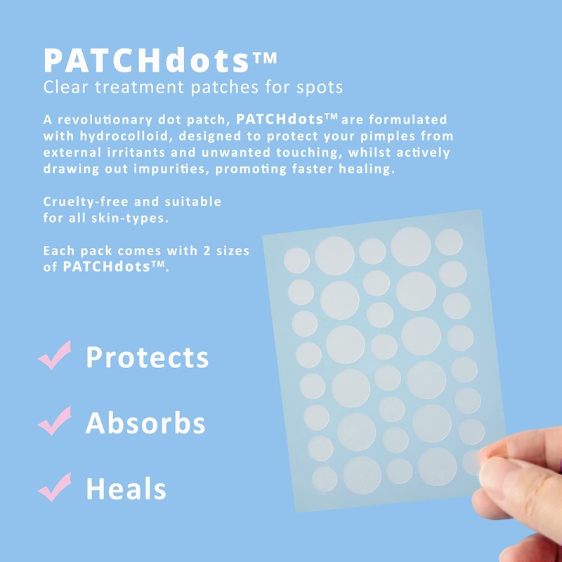 PATCHdots Original Spot Patch is a Thin and Translucent patch formulated with premium hydrocolloid to actively draw out Pus, Oils and Impurities from your Pimples. Suitable for All skin types, PATCHdots promotes faster healing in a clean and moist environment away from external irritants and unwanted touching.