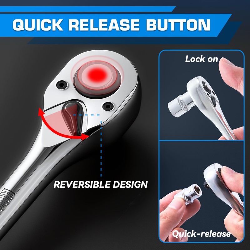 - Quick Release: The socket wrench includes a precision-engineered ball detent that locks the socket in place, preventing it from falling off during use. The one-touch quick release button allows for easy socket changes, even with one hand, improving your workflow