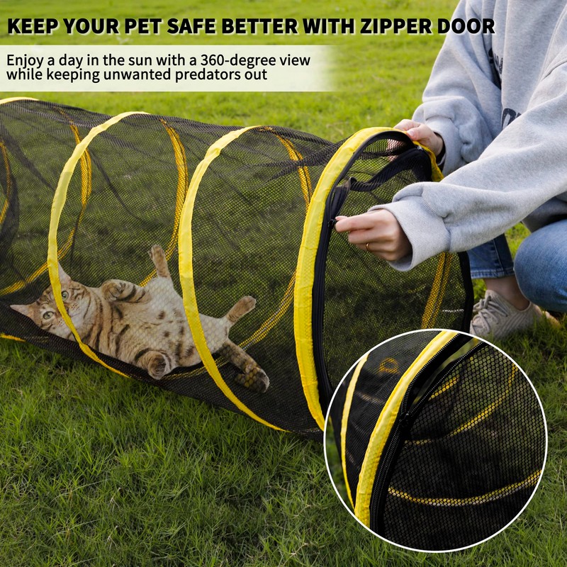 - 【DURABLE & HIGH-QUALITY MESH】 Our outdoor cat house is of solid construction with perfect size. Tight and high-quality mesh, Strong and durable zippered doors, bendable and sturdy support rods are made of premium material. Double strength anti-scratch pet tent for indoor cats with 4 steel tent stakes for staking down your outdoor cat enclosure. WHAT YOU GET: Contains one cat tunnel, and one carry bag