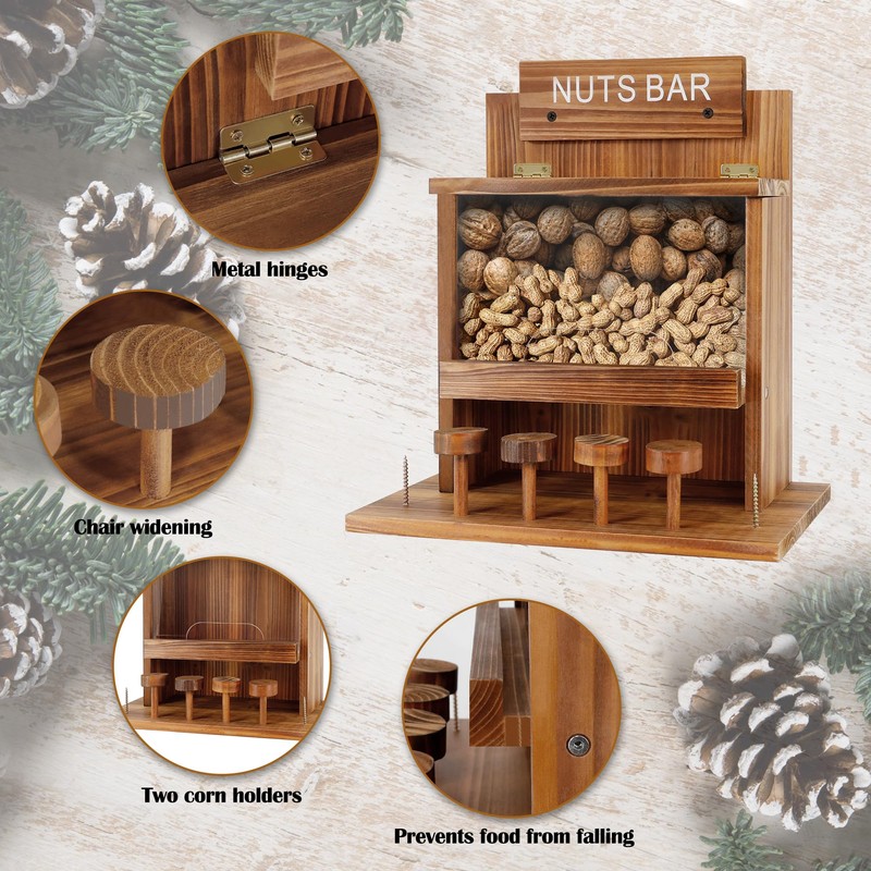 - UPGRADED Wood Squirrel Feeder: Our squirrel feeder enhances perching experience. - Boasts 4 spacious perches, providing a comfortable space for squirrels to enjoy their meal. - Featuring a smart design, squirrel house includes a food groove and acrylic panel. Nuts naturally slide down to the accessible window area and prevent food from falling out. - Besides, the extended base is designed for corn cob or other fruits, allowing squirrels to stand on it and eat food