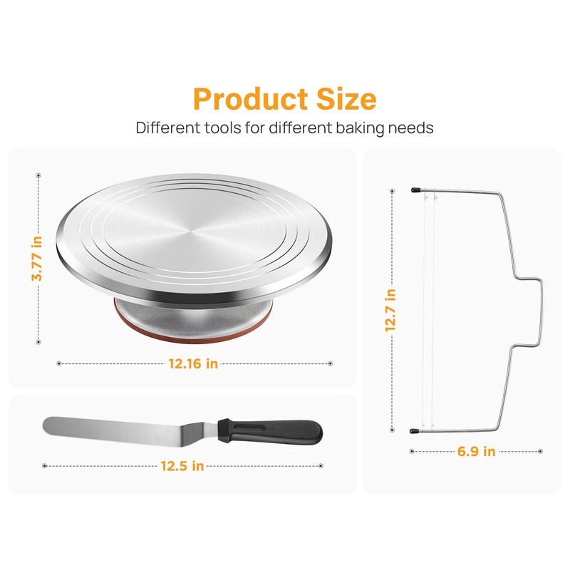 - 12 Inch Cake Turntable: Constructed with heavy-duty aluminum alloy, non-slip surface & rubber feet provide excellent stability on the countertop, keep the cake stand from moving, and can help you get to all sides of the cake.