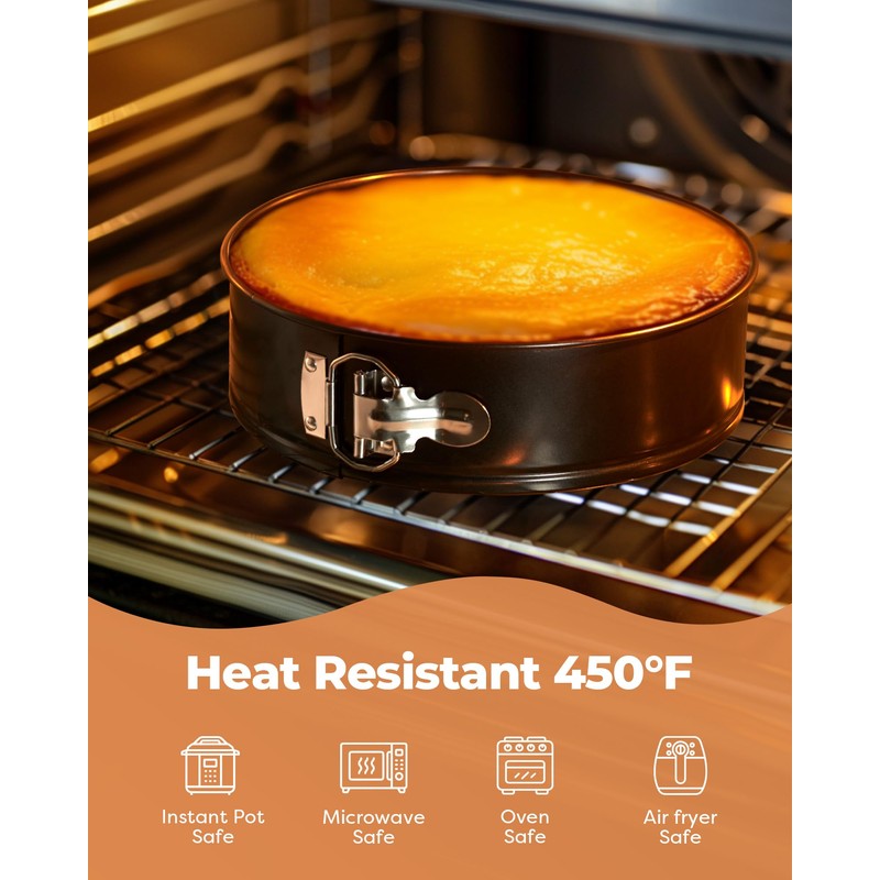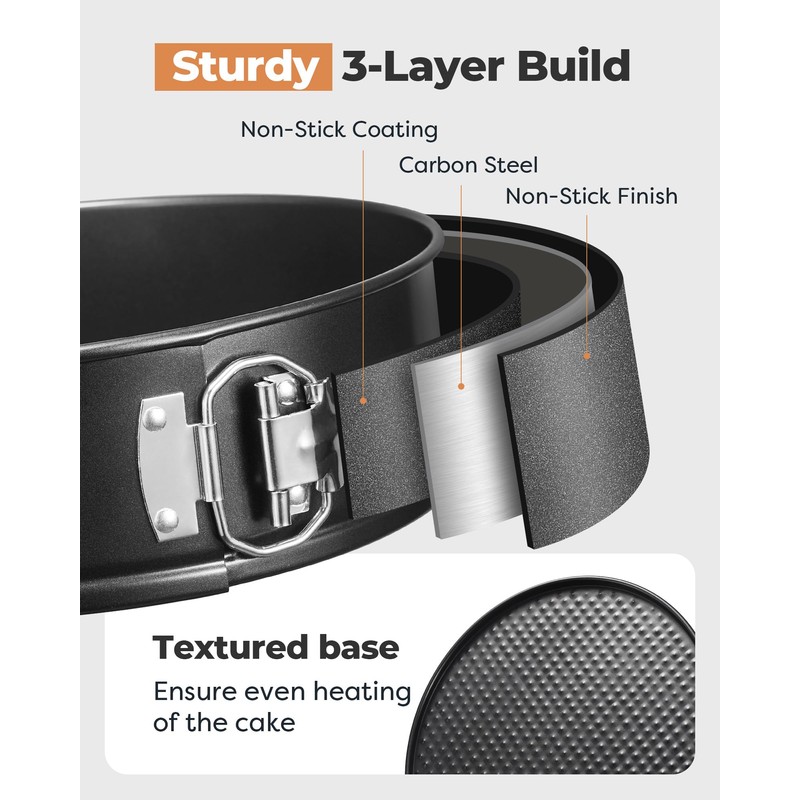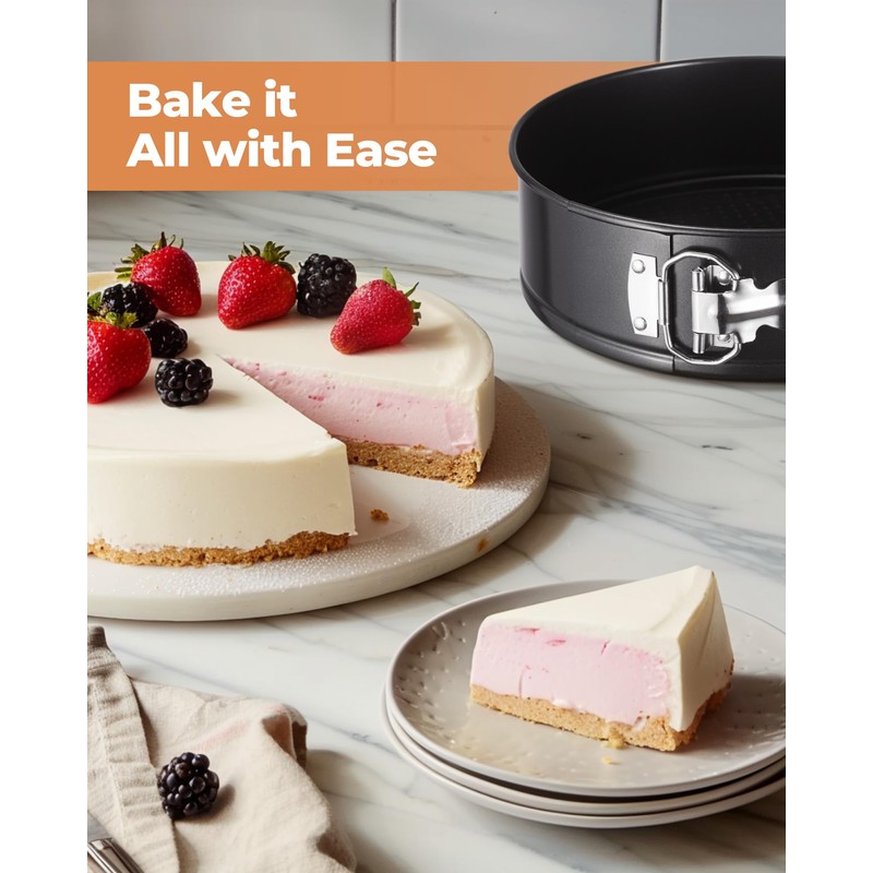 - Easy Release Baking Pans: Each springform pan consists of two parts with a detachable bottom and a 3-inch high surround. This design proves helpful when baking delicate cakes like flourless chocolate cake or cheesecake. After baking, simply release the latch on the surround and lift it upwards to easily retrieve the cake without the need to invert it, thereby maintaining the cake's integrity.