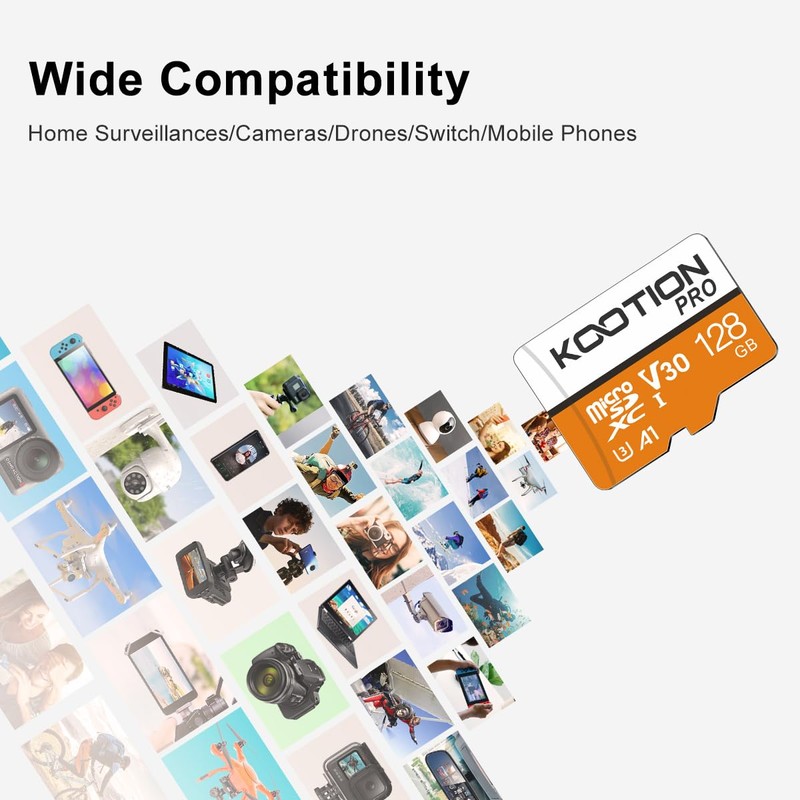 - Wide Application: The 128 GB micro SD card is perfect for Android smartphones, tablets, digital cameras, game consoles, dash cameras, drones and surveillance system etc; It can use to store or back up high-res photos, videos, music and more