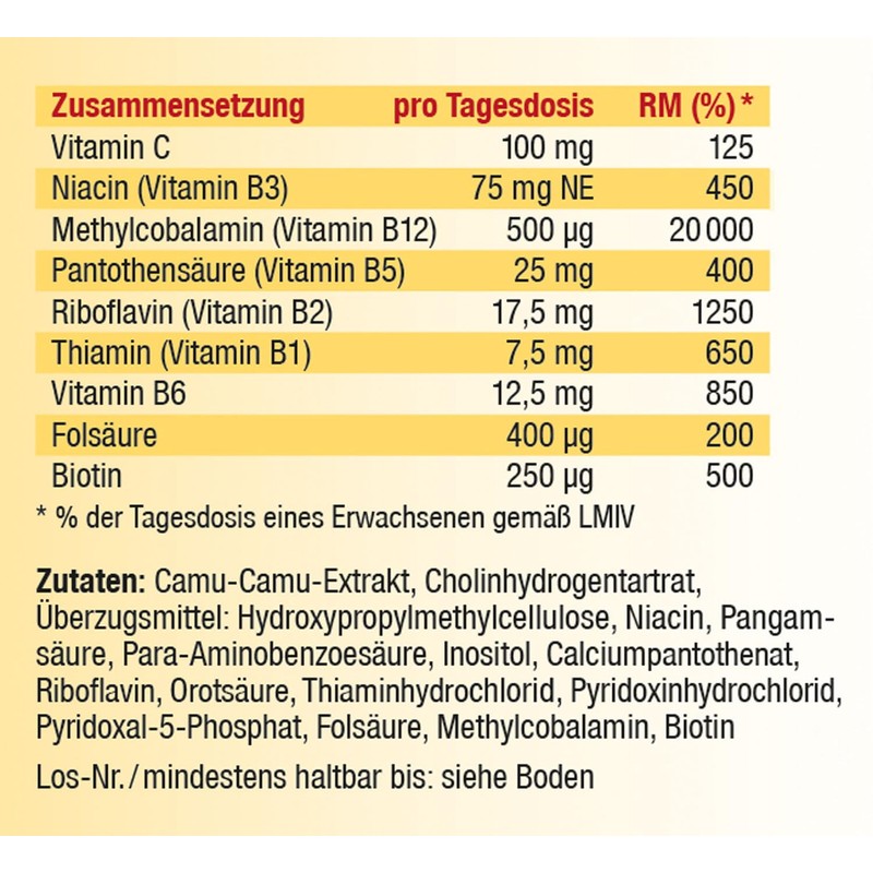 This is a high-dose formulation of six different B vitamins, various ingredients of the vitamin B group and vitamin C. The vitamin C comes from camu camu extract and is of plant origin.
