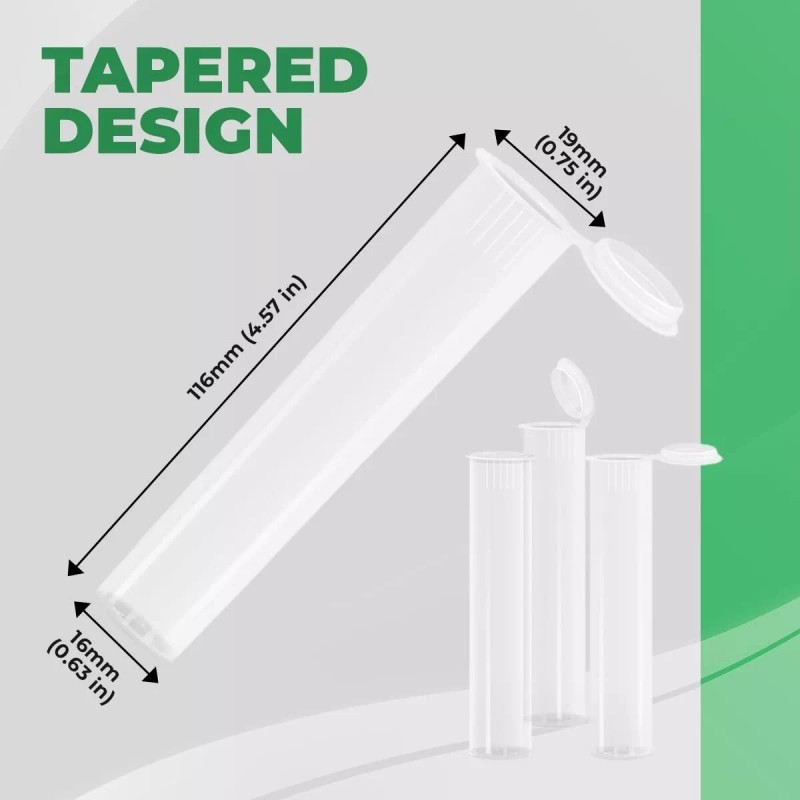 - 116mm Pop Top Tube 🔥- This smell proof container is for discrete and low-profile storage of paper goods, such as cash, cigarettes, and novelties, perfect for storing your edible items, herbs, and spices. These 116mm tubes are tapered and are 4.57-inches (116mm) in length, 0.75-inches (19mm) in top diameter, & 0.63-inches (16mm) in bottom diameter. These pop top tubes come in a pack of 100 and can double as a cigarette case or pill bottle.