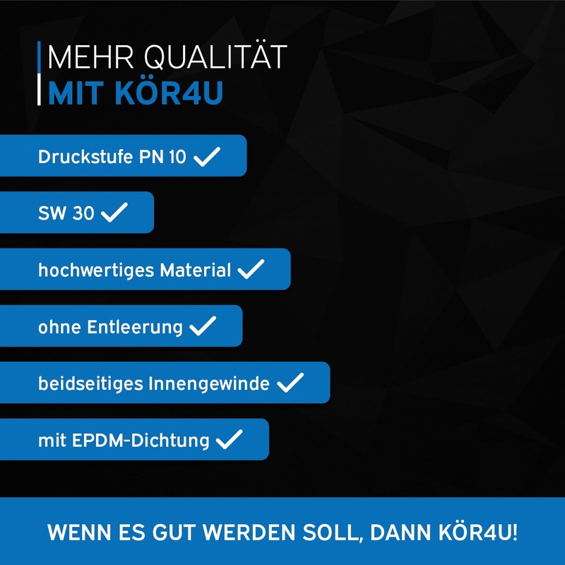 It is an intelligent solution for a wide range of applications and offers reliable functionality that meets the needs of different environments. The characteristic feature of this valve is its internal thread on both sides, which allows for effortless installation in different pipe systems. This feature opens up numerous applications in sanitary engineering, heating installation, water supply, industry and many other industries. Another great advantage of this valve is its emptying function, which is crucial in certain applications. Thanks to the non-emptying design, it is particularly suitable for systems where a controlled flow must be guaranteed without the need to drain liquids. This is especially important in applications where media loss or environmental impact should be avoided. The pressure level of this valve is PN 10, which indicates its ability to withstand pressures of up to 10 bar. This impressive pressure tolerance makes it an excellent choice for applications where high pressure loads can occur. This valve will meet your requirements, whether in water treatment, industrial processes or in heating and cooling systems. Another notable feature is the EPDM gasket (ethylene propylene diene rubber) used in the valve. This seal provides excellent resistance to various mediums, including water, steam and many chemical substances. The EPDM seal ensures a tight seal and minimizes the risk of leakage, increasing the reliability and efficiency of your system. In summary, the kör4u Angle Seat Check Valve is an extremely versatile and reliable component made of hot pressed brass that is perfect for a variety of applications.