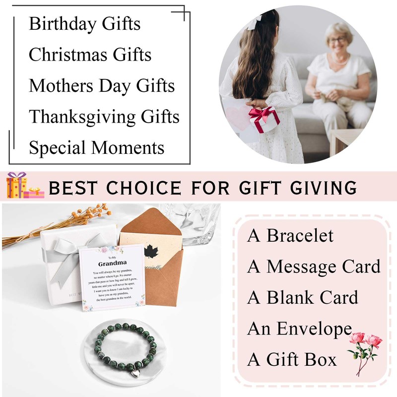 - Gifts Ideas for Grandma: Bead Bracelet comes in a beautifully designed package, ready to be presented with love and care. There is a message card and a blank card for you to write blessings for your grandma. The thoughtful presentation makes this bracelet the perfect grandma birthday gifts/ christmas gifts/ mothers day gifts from grandchildren