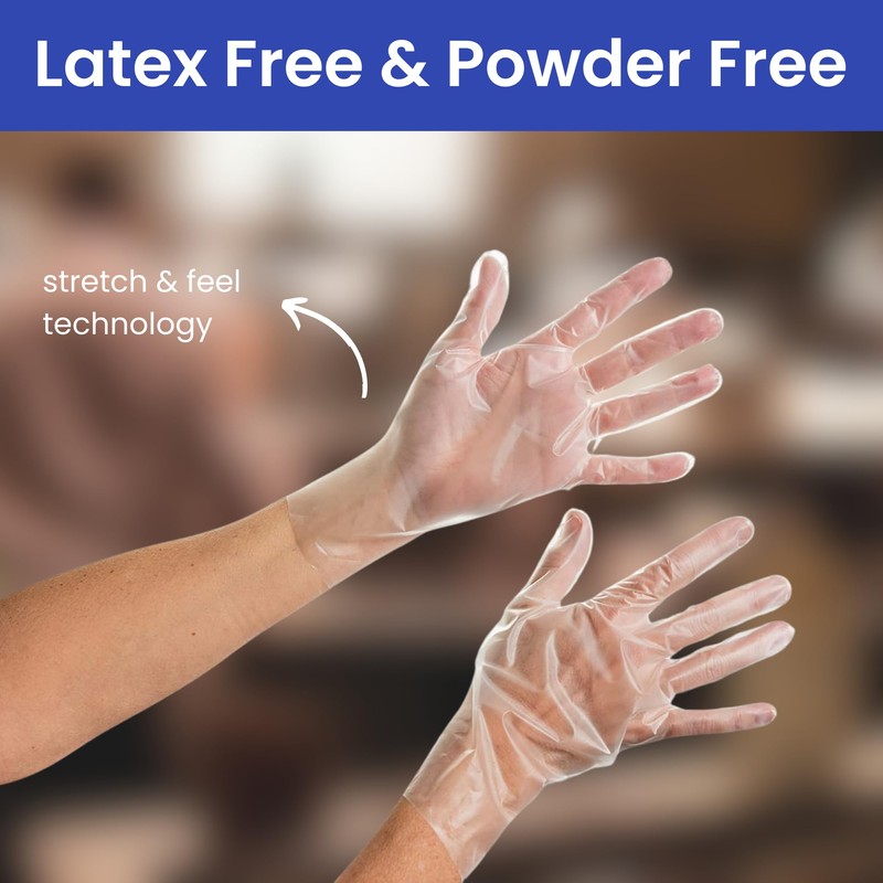 - LATEX & POWDER FREE: These single use gloves are latex free and powder free, making them usable for people with sensitive skin, reducing hand irritation and allergic reactions. A powder free glove ensures no residue on hands or cross contamination. Made from TPE (Thermoplastic elastomer), which is a specialist grade of polythene, to give "stretch & feel" technology.