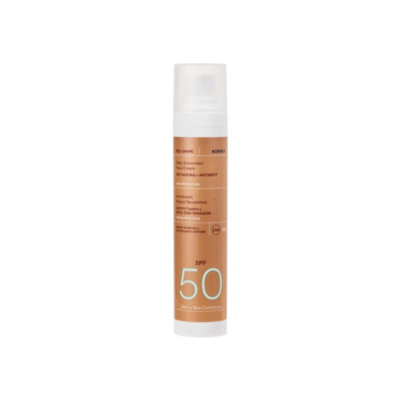 Korres Red Grape Sunscreen Face Cream SPF50 is a light-textured sunscreen that gives instant natural glow and protects the skin from photoaging.
