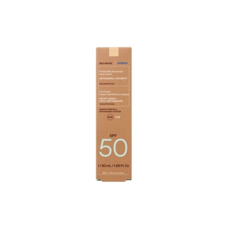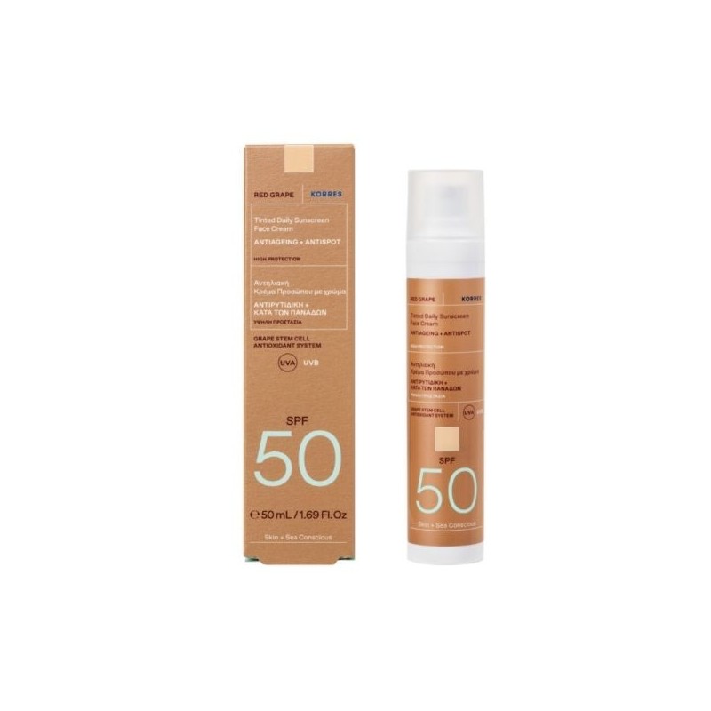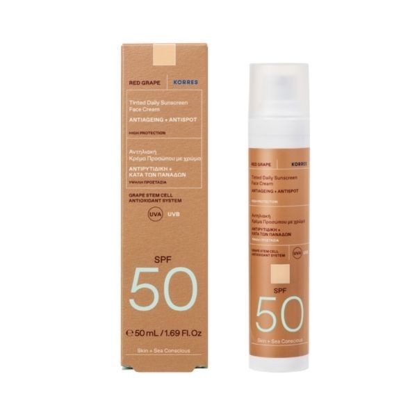 Korres Red Grape Tinted Sunscreen Face Cream SPF50 is a light-textured sunscreen that gives instant natural glow, uniform skin tone and protects the skin from photoaging.