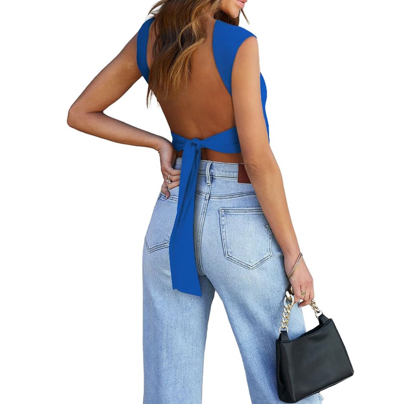 korssyee playera corta sin espalda para mujer, con lazo en la espalda, sexy, para salir, ajuste delgado, lindas camisetas Y2K a la moda 2023, Azul, M