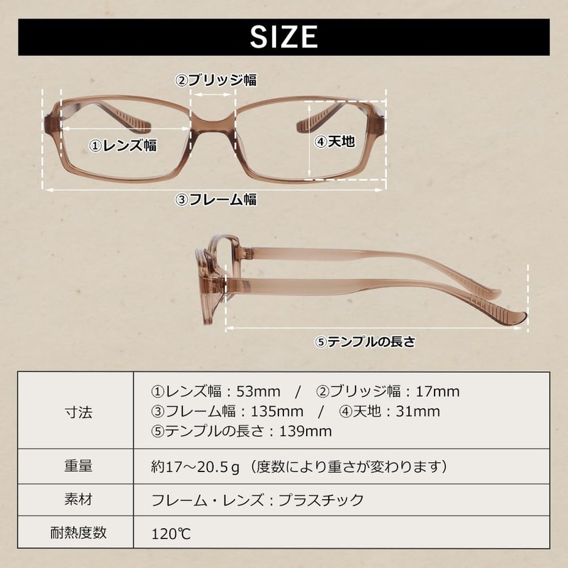 | Size: | レンズ幅/53mm、ブリッジ幅/17mm、テンプル長/139mm |