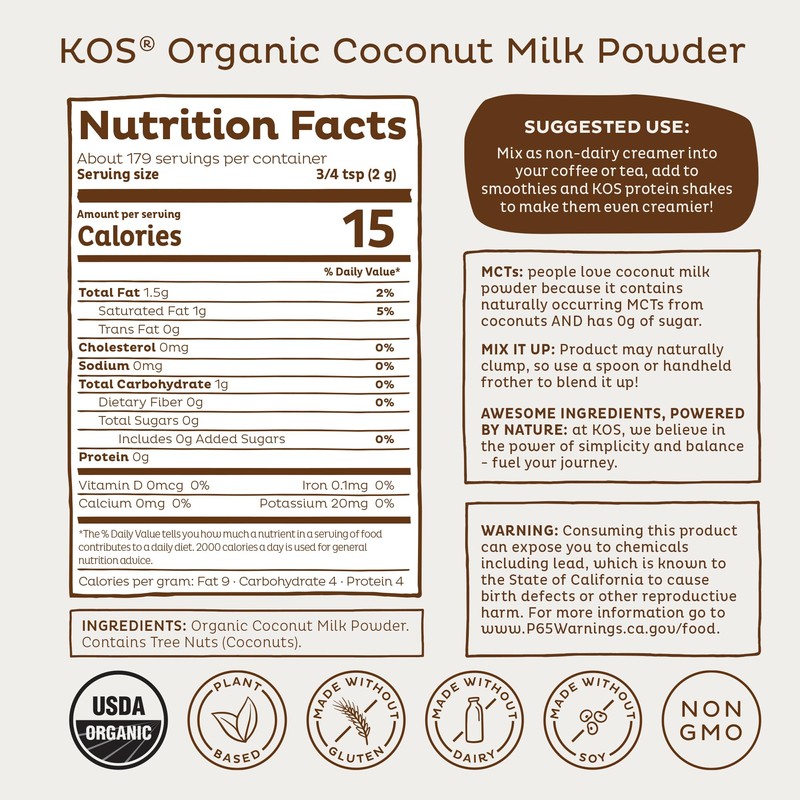 KOS Organic Coconut Milk Powder, USDA Certified Organic - 0g Sugar, MCT Plant Based Creamer for Coffee, Smoothies, Vegan, Keto, Paleo Friendly, Non-GMO, Gluten or Dairy- 12.6oz, 179 Servings
