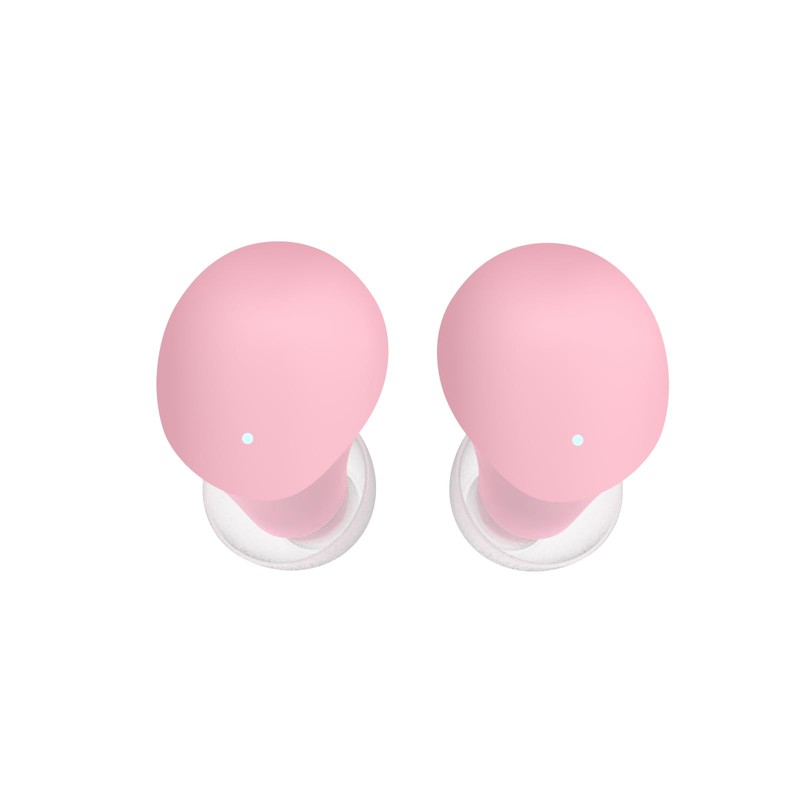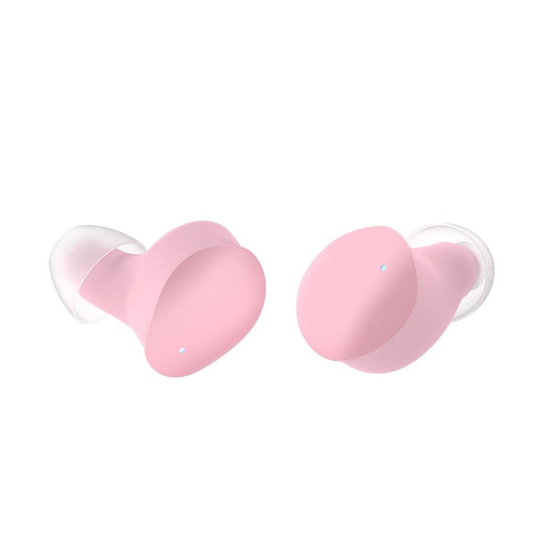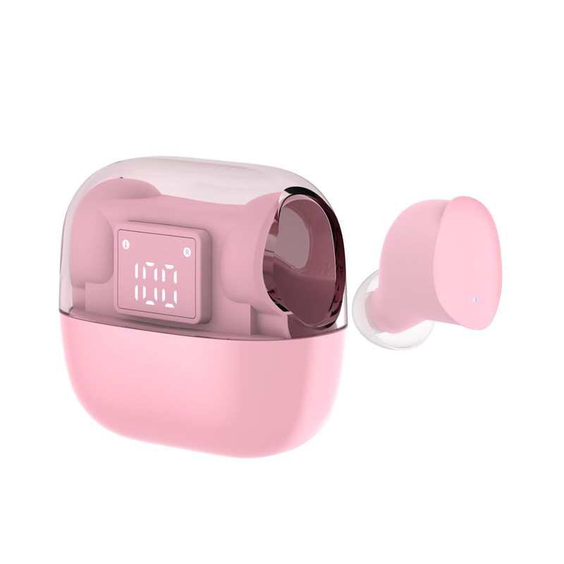 - Stylish and unique pink wireless earbuds with transparent shell design, perfect for young women.