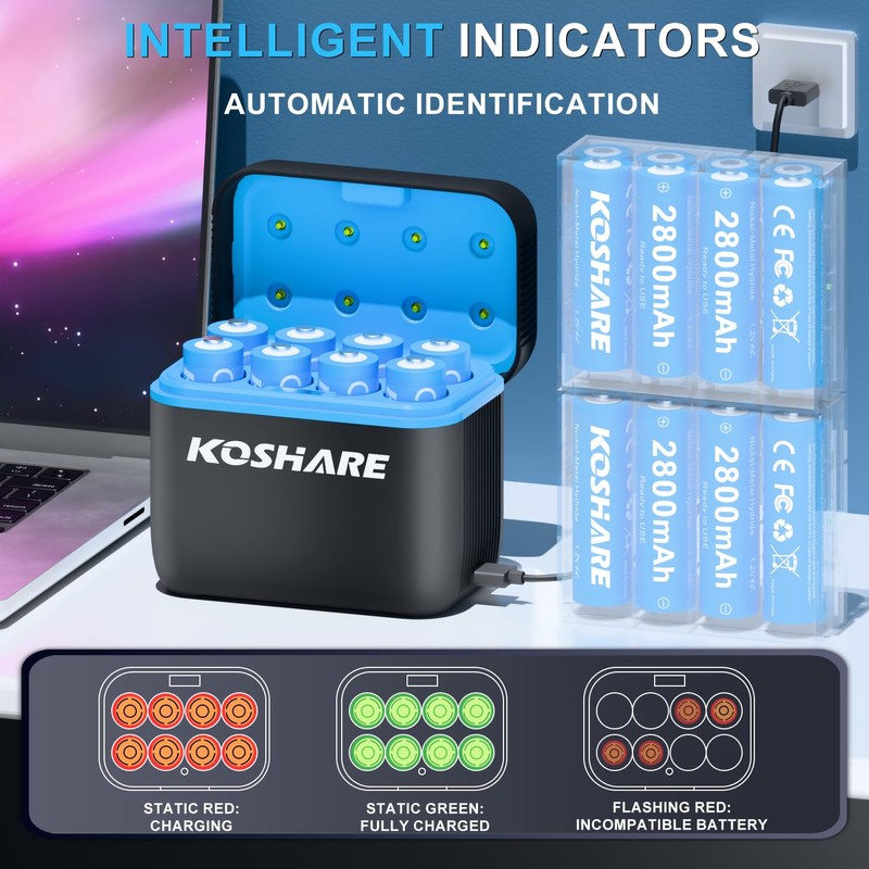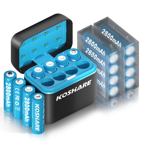 KOSHARE 16 Pack Rechargeable Batteries Ni-MH AA with Charger, 1.2V 2800mAh Ni-MH AA Battery High Capacity with 2 Plastic Boxes, Reach up to 800 Times, Pre-Charged (Black+Blue, 16AA+8Slot Charger)